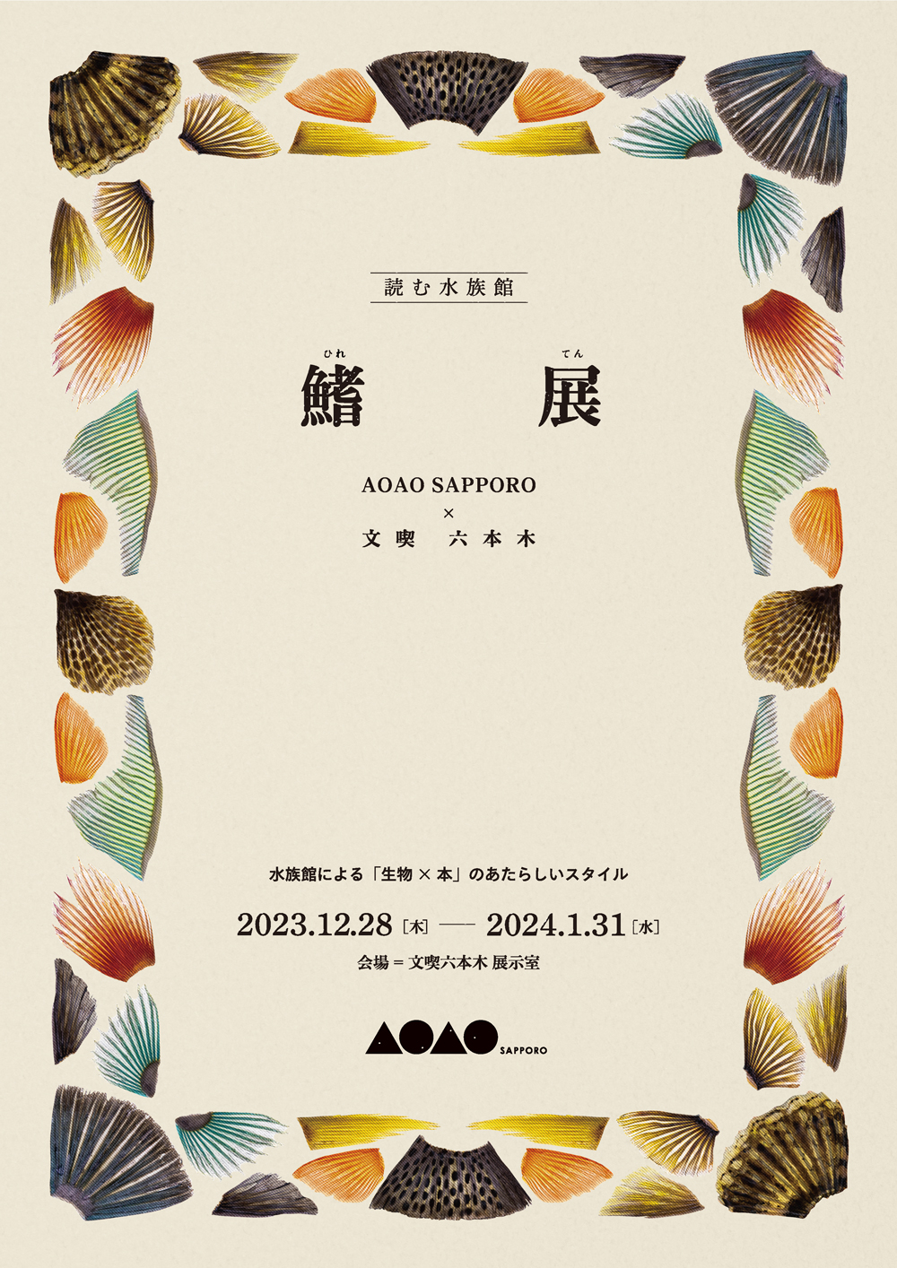 六本木 文喫で2023年12月-2024年1月の期間に開催した「読む水族館 鰭展」のデザインを担当。 この展示は札幌の水族館「AOAO SAPPORO」と六本木の書店「文喫」のコラボレーション企画で、 ウオヒレウロコ氏がコレクションする魚の鰭と、AOAO SAPPOROの書籍ディレクター浦上宥海氏が選書した鰭をテーマにした本が合わせて展示されました。 鰭の額装や、展示全体のディレクションと設営も実施。